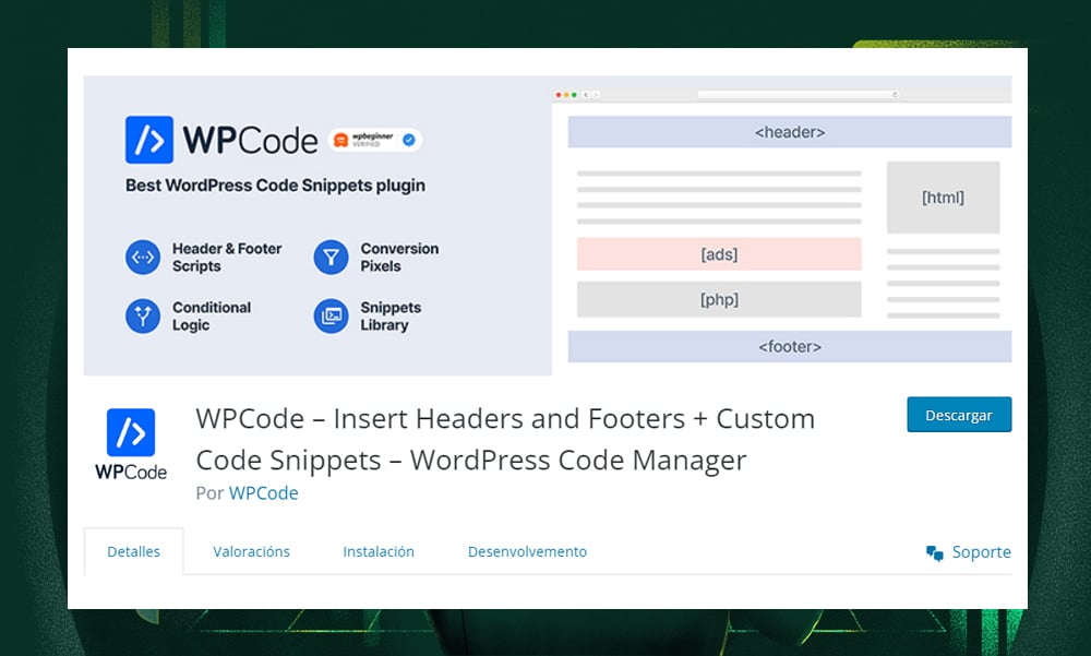 - Adds code snippets on any part of your page, like the header footer, above, or below a content