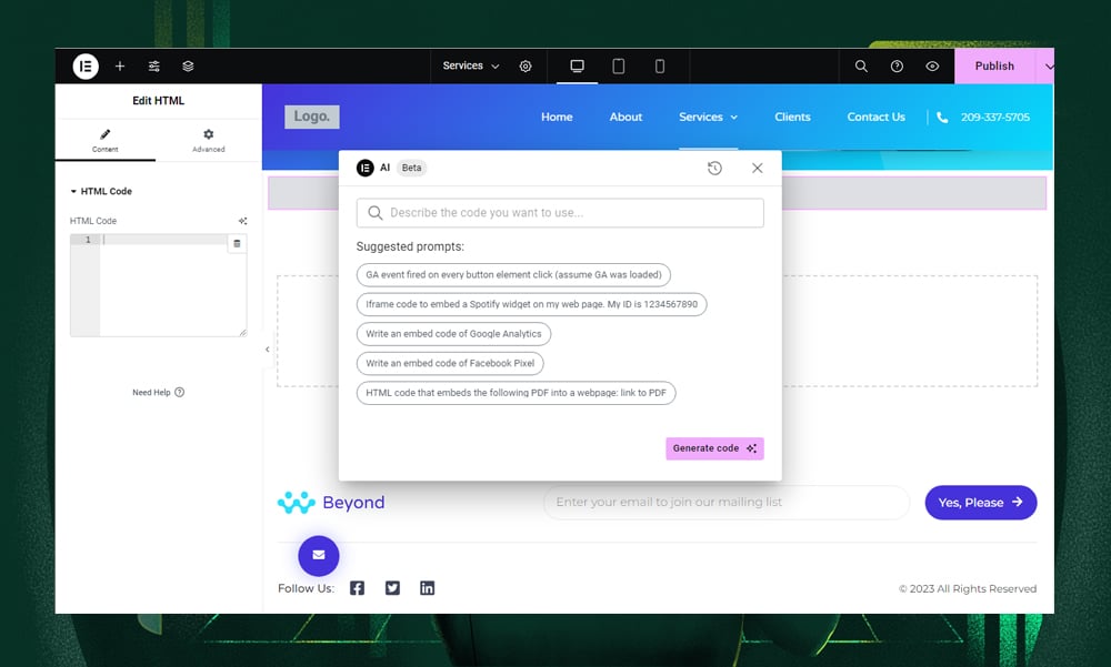 Another feature we find incredibly useful is its capability to create custom codes. This means you can add code snippets to enhance your site’s user experience. Elementor AI also integrates tracking tools like Google Analytics or Facebook Pixel so that you won’t have to write a single piece of code. You’ll find the AI assistant handy if you have a bit of experience in WordPress development but lack coding experience.