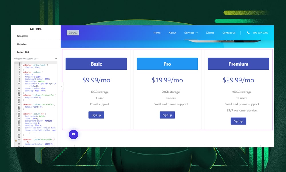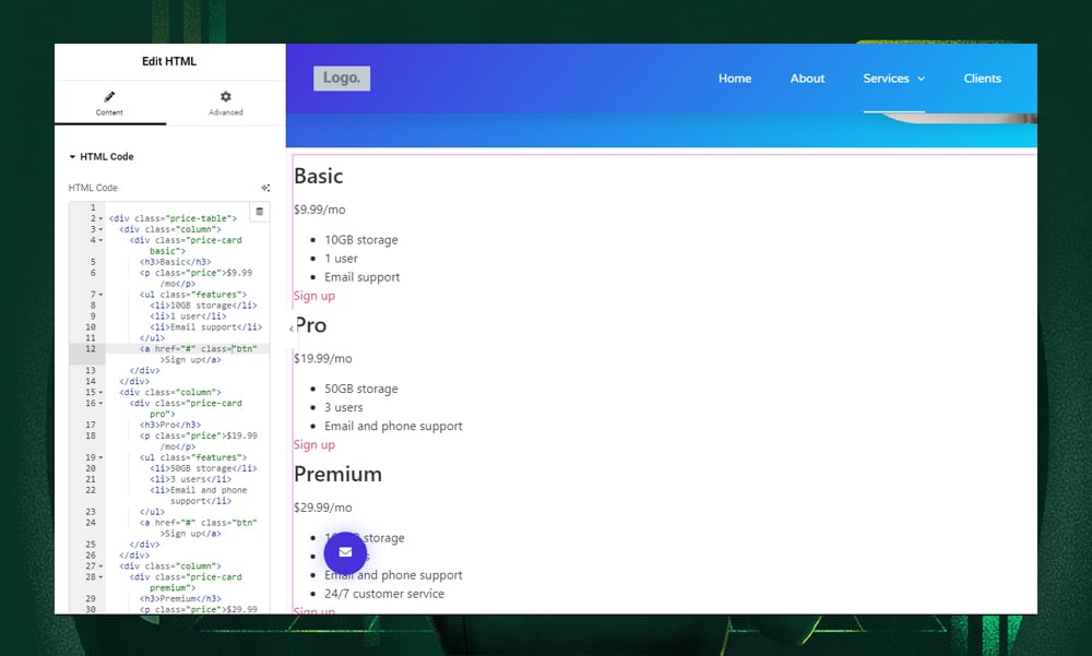 Let's say you want to add a price table. In the editor, drop in an HTML widget and ask the AI assistant to write the HTML code for you. Be clear and detailed in your request, or tweak one of the AI's suggested prompts to suit your needs.