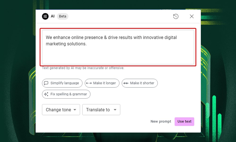 Now, it might take a couple of tries to get the right output. Elementor AI is not quite like ChatGPT where you can hold a conversation and simultaneously make adjustments to your prompt to refine the output.