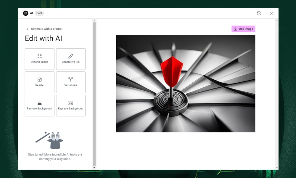 - Generate and Edit Images: Adding stunning photos to your articles or e-commerce pages has never been easier with AI. By simply entering keywords, Elementor AI provides image suggestions that align with your site's theme and content. It also offers several options to enhance your images, from changing the dimensions to replacing the backgrounds.